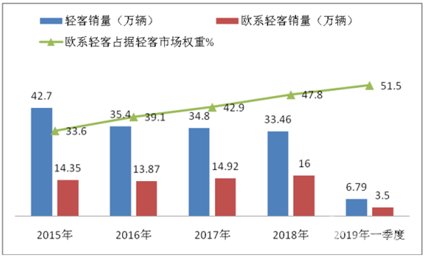 可见,2015年—2019年1-3月欧系轻客销量占据轻客整体市场的权重从33.6%逐年提高到2019年一季度的51.5%,可谓一路“飙升”。