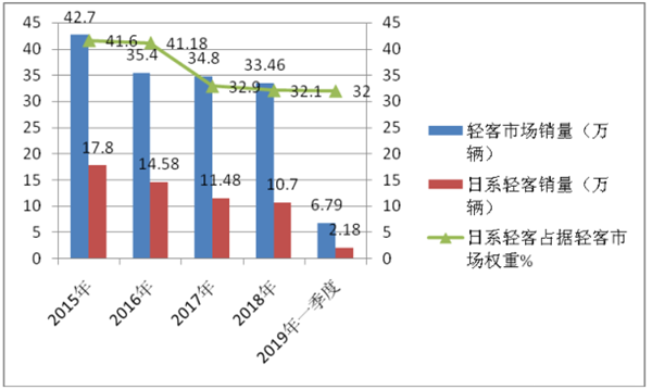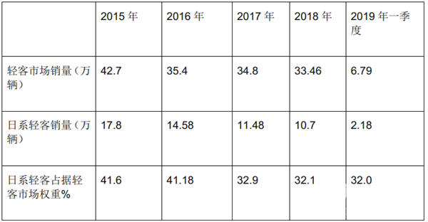 可见,2015年—2019年1-3月日系轻客销量占据轻客整体市场的权重从33.6%逐年下降到2019年一季度的32.0%,可谓“江河日下”,萎缩态势明显。