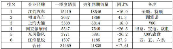 2019年一季度6个主流的欧系轻客品牌销量中,4家销量同比均为负增长,2家同比正增长;其中老大江铃轻客占据欧系轻客的市场份额达到45%,且同比销量下降达到16.9%,6强一季度销量同比下降17.61%,可见,欧系轻客市场近期市场也不尽人意,这主要与近期客车市场大环境不太好有关。