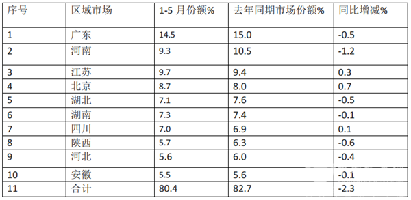 1、2019年1-5月广东、河南、江苏是销量最多的前三甲,广东最多,占据市场份额为14.5%。