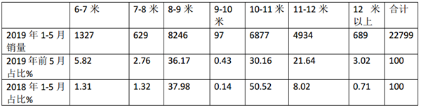 根据上牌信息统计,2019年1-5月新能源客车按长度段划分销量结构如下表
