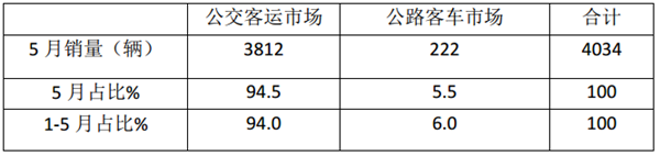 根据数据统计,2019年5月销售的4034辆新能源客车中,有3812辆是用于公交客车市场,222辆用于团体客车等公路客车市场。