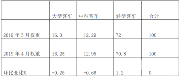 根据中汽协数据,2019年5月大中轻客车权重环比统计:
