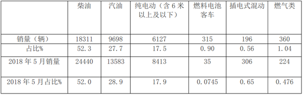 根据上牌信息,2019年5月按燃料种类划分,客车销量结构特征如下:
