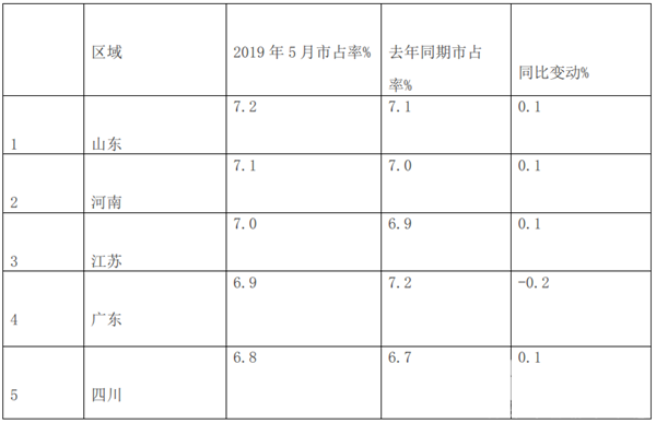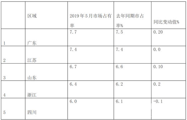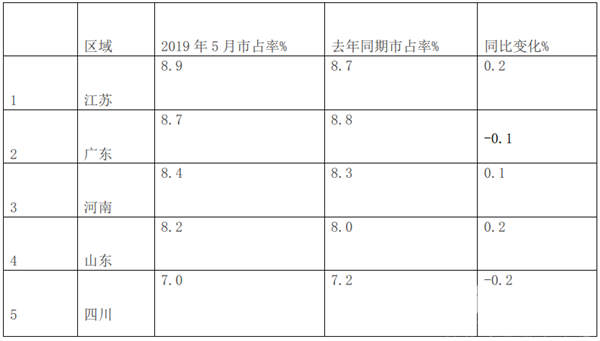 1、根据上牌信息统计计算,2019年5月,全国重点区域大型客车市场份额统计表