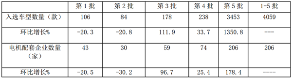 2、第5批推荐《目录》入选的新能源汽车车型最多,参与配套的电机企业数量也是最多。