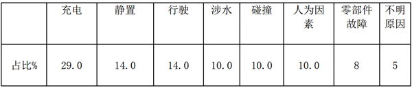 事实证明,动力电池安全问题引起电动汽车事故频发的主要原因。根据欧阳明高院士介绍,电动车充电时发生事故的比率较大。2018年,充电时发生纯电动汽车事故占比达到了29%,接近三成。而静置、行驶、涉水发生事故的比例分别为14%、14%、10%。动力电池引起电动汽车事故的各种因素及概率占比具体统计见下表: