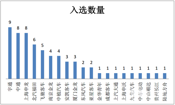 1、 宇通入选车型最多达9款,不愧是客车老大,占比为14.3%。