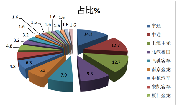 2、中通客车和上海申龙位居第二,分别入选8款车型,占比均为12.7%。第三是北汽福田,入选车型为6款,占比为9.5%.