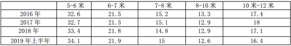 房车是在客车平台上改装而成,是功能较多的专用客车。根据统计,近年及2019年上半年,按车型长度划分,房车销量结构占比如下表: