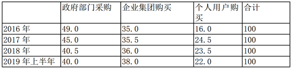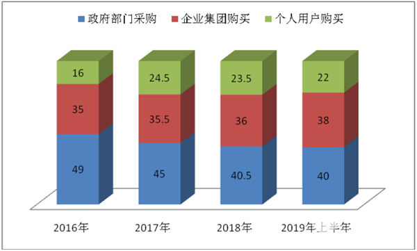 四、政府部门采购占比最大,但占比逐年减少;而企业集团占比第二,个体用户最少,但后而二者占比均呈现逐年上升态势