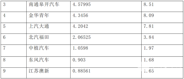 3、 北汽福田和上海申龙投产均为4款车型,占比为7.84%,并列季军。