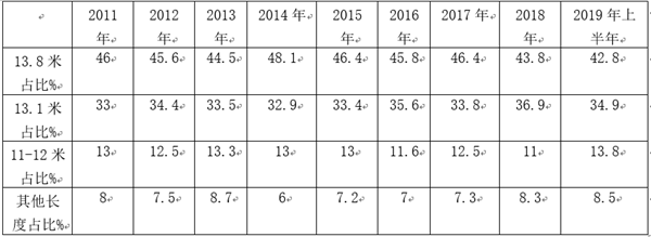 2、13.1米段占比为始终占据在35%左右的市场权重,为次大。