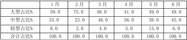 1、大型新能源客车占比在1-6月各月中,最低的月份是4月,占比为41%,最高的月份在2月达到75%;从3月往后,每个月的占比都稳定在40-50%之间,大型客车主要是应用在公交场景。