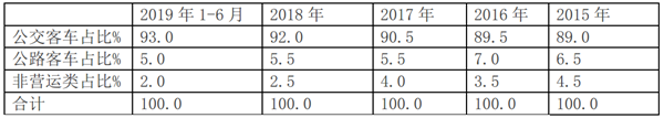 1、 在2019年上半年客车各细分市场中,公路客车占比超半壁江山,为最大;其次是公交客车市场。两者累计占比超越94%。