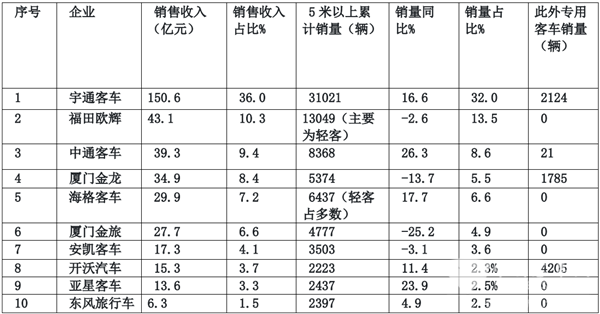 根据数据统计,2019年1-7月,中国客车行业销售收入416.9亿,同比增长11.9%。7月份实现销售收入74.3亿,同比增长72.4%;中国客车行业5米以上客车产品累计销售96832辆((不含专用客车)),同比增长-2.7%,2019年1-7月前10名主流企业销售收入及销量(5米以上)统计如下: