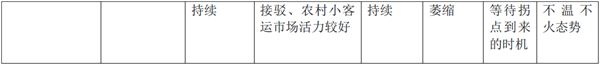市场活力评估活力较强,且可持续活力一般,相对平稳,可持续活力较差,尤其是大中型客运市场活力较差,而接驳、农村小客运市场活力较好活力较好,但不一定能持续活力较差,且可能持续萎缩暂时活力较差,在等待拐点到来的时机总体看,活力不够,处于不温不火态势