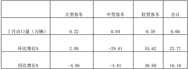 根据中汽协数据,7月,客车出口表现好于上月,当月环比和同比均呈较快增长。共出口0.66万辆,环比增长23.77%,同比增长16.16%。