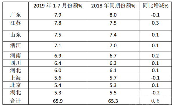 特点四:从区域流向看,广东、江苏、山东位居前三甲;前10名市场集中度65.9%,同比提高0.6个百分点,垄断程度微增