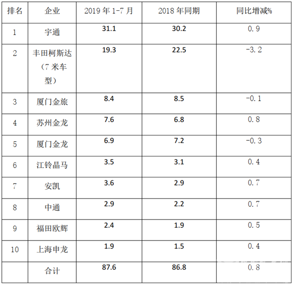 根据统计数据,2019年前7月前10名团体客车品牌市场集中度及同比统计: