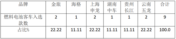 特点三:入选氢燃料电池客车车型9款,金旅、申龙和云南五龙各2款,其余3家企业均为1款,8款为城市客车,1款为公路客车(申龙),