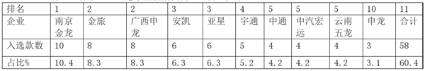 可见,在2019年第8批新能源客车推荐目录中,南京金龙入选车型最多10款,占比10.4%,其次厦门金旅和广西申龙均为8款,再次是安凯客车及亚星客车均为6款,前10名企业累计入选58款车型,占比为60.4%,超6成。