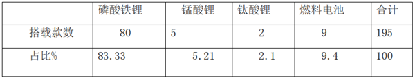 特点五:从搭载动力电池来看,搭载磷酸铁锂电池占比83.3%,居于绝对老大地位,氢燃料电池占比9.4%,锰酸锂占据5.21%,钛酸锂占比2.1%,为最小