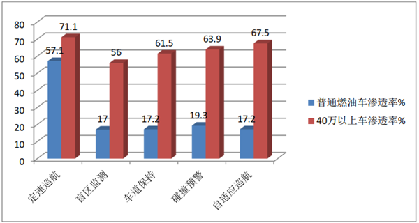 其次,2019年正处于5G发展初期,对于5G时代的想象,自动驾驶的普及是其中的重要一环,受限于当前车联网技术的滞后,以及低时延网络的普及等基础条件的缺失,目前我们距离真正的自动驾驶技术还有一段距离。在人工驾驶和自动驾驶的过渡阶段,自动辅助驾驶是目前整个汽车行业的重要发力点。所谓自动辅助驾驶系统,其实就是以毫米波雷达、红外雷达、超声波雷达和车载摄像头作为主要传感器所实现的车道保持辅助系统、自动泊车辅助系统、刹车辅助系统等等,其主要目标在于弥补完全手动驾驶的不足,营造更好的驾驶体验。而完全的自动驾驶汽车,则是试图以高精度激光雷达、高精度地图和高度发达的人工智能算法为基础,彻底实现无人驾驶。完全的自动驾驶虽然离我们还有一段路要走,但最近两年自动辅助驾驶却已经得到了大范围的普及。目前市面上的所有燃油车中,定速巡航、盲区监测、车道保持、碰撞预警、自适应巡航的整体车型渗透率为 57.1%、17%、17.2%、19.3%、17.2%。而在 40 万以上的价位区间里,这些功能的渗透率则分别达达到了71.1%、56%、61.5%、63.9%、67.5%(具体见下图,数据来源公开资料)。根据资料显示,当前市面上的新车基本都实现了L1级别的自动驾驶功能,能够实现独立调节速度、轻度转向干预、防追尾和车道偏离预警系统等自动辅助驾驶功能,到2020年左右,自动驾驶汽车的渗透率就将达到40%以上。