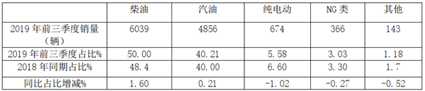 根据上牌信息,按动力种类划分统计2019年前三季度考斯特客车销量结构表: