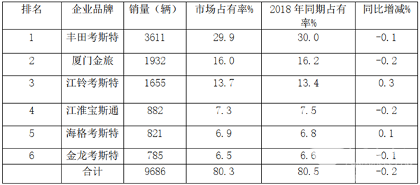 根据上牌数据,2019年前三季度前6名企业考斯特客车销量及市占率%
