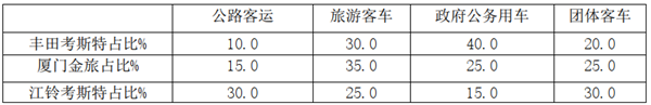 特征六、丰田考斯特在政府公务用车占比最高;厦门金旅在旅游客运领域占比最高;江铃考斯特在公路客运领域占比最高