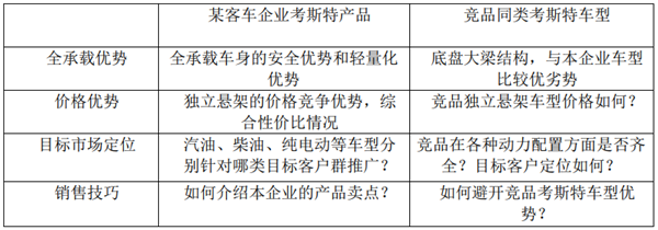 比如某客车企业对销售人员主要培训产品卖点,熟悉竞争对手同类产品的优、劣势,主要培训项目: