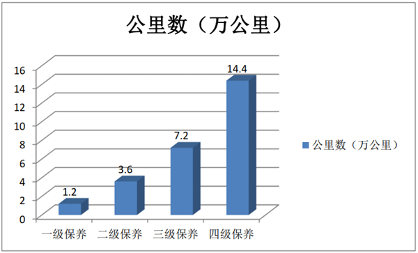 目前通常行业现行的车辆保养规范为四级定程保养,一级保养1.2万公里、二级保养3.6万公里、三级保养7.2万公里、四级保养14.4万公里。