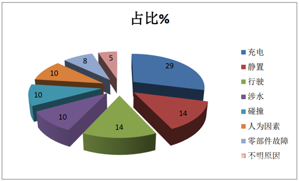动力电池和高压系统是新能源车辆的核心安全部件,在为未建成监控大数据平台前,可通过客车厂安全监控平台对相关安全状态和故障报警进行管理,新能源车监控大数据平台建成后,公交公司可组织管理人员实时监控车辆状态,及时发现车辆异常状况,针对不同级别的车辆故障报警和突发状况,按相应的应急预案采取措施,减少车辆机务安全事故的发生。根据市场调研,近年新能源客车发生事故的原因主要是动力电池不安全因素引起的,尤其是充电管理不当引起火灾等事故较多(占比近3成,见下图)。根据笔者对近年国内新能源客车安全事故的原因调研得知,各方面的原因都有,基本可以归纳为:零部件故障、充电、浸水、碰撞、被引燃、人为因素、不明原因等方面。大致比例如下: