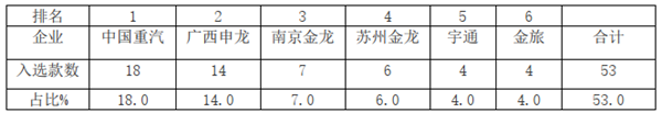 根据第10批《目录》数据统计,前5名(2家并列第5)客车企业入选车型款数及占比,占比如下: