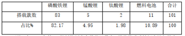 根据第10批《目录》统计,从搭载动力电池来看,本批次入选的101款新能源客车,其中83款搭载磷酸铁锂电池,11款搭载氢燃料电池,5款搭载锰酸锂电池,2款搭载钛酸锂电池。