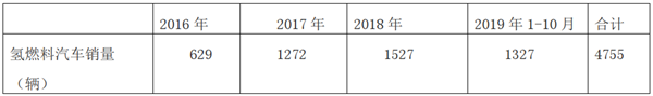 表3:2016年-2019年氢燃料汽车销量(数据来源:中汽协)