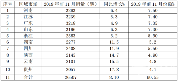 1、人口及经济大省河南、江苏、广东、山东等区域是前2019年前11月村村通小客运市场的重点区域,市场占比最高,但销量同比增幅只有个位数,说明村村通小客运市场增长势头并不强劲。