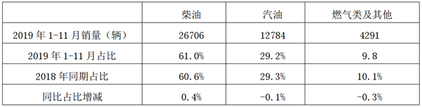 上牌信息显示,2019年1-11月,农村客运市场中销量占比最大的是柴油动力车型,其次为汽油。柴油占比近超6成(61%,见下表),且同比增加0.4个百分点。