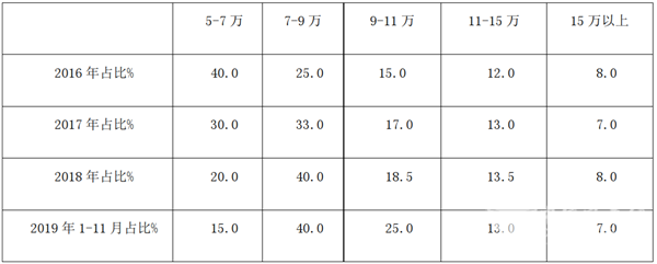 1、“村村通”小客运市场在按价格划分的市场结构中,由2016年5-7万是最大区间逐年演变为2019年前11月的7-9万是最大价格区间,其次是9-11万,说明在建设社会主义新农村中,村村通小客运市场对车型档次需求提高了,但也很有限,如15万以上的产品需求权重就很小了,毕竟我国广大农村尤其是边远地区的经济条件还是十分有限。