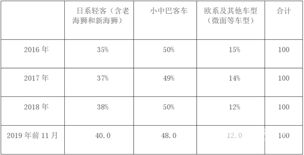 1、根据调研可知,近年日系轻客市场相对欧系轻客总体是处于明显下降的态势,从细分市场看,日系轻客主要下降的细分市场是占据轻客约60%的市场---客货两用市场、城市物流市场及专用车市场。但日系轻客车型近年在“村村通”小客运市场车型占比比较稳定。因为“村村通”这个细分的小客运市场,日系轻客比欧系轻客更有优势,主要是因为日系轻客车身比较窄,车体比较轻,因此“小巧”,行驶在比较窄的“村村通”乡村公路上容易掉头和转弯,导致日系轻客在“村村通”客运市场反而占据一定优势,预计这个趋势在2020年还会延续。同时,在村村通小客运市场,国家“453”号法规执行相对比较宽松一些,这对日系轻客向村村通小客运市场发展比较有利。