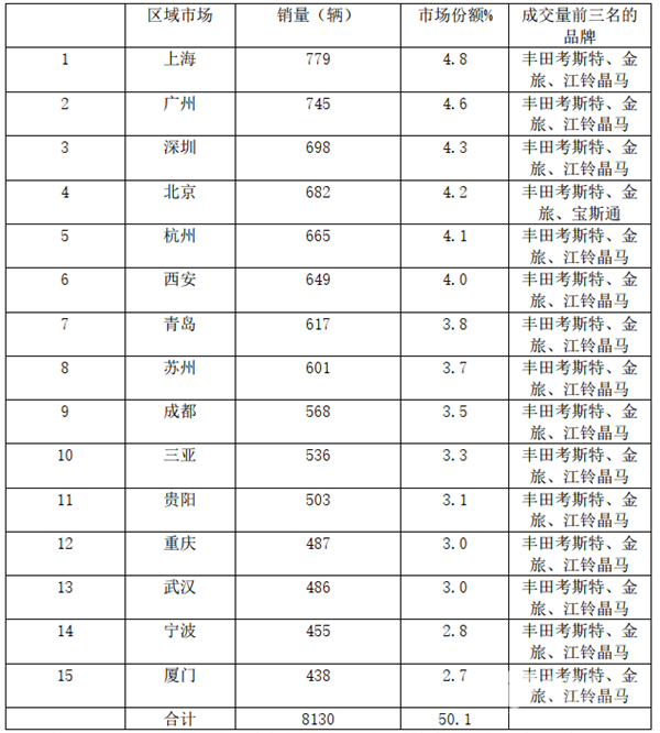 特征四、上广深占比最高,旅游类地区表现突出,丰田考斯特、金旅、江铃晶马是成交最大的前三品牌