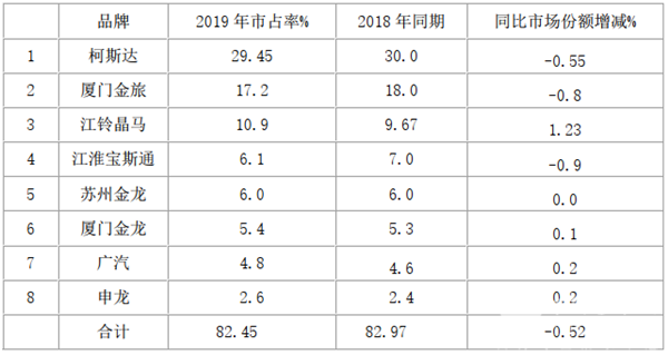 据数据统计,前8名考斯特客车品牌销量份额及同比: