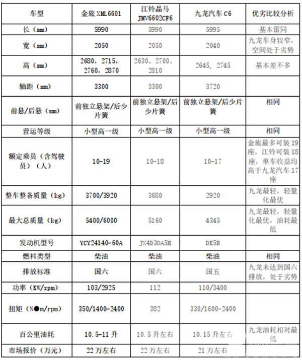简析,从上表分析3家国产6米小型高一级考斯特产品的配置参数,各家有自己的竞争优势: