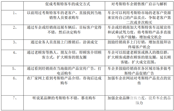 特征七、老客户重复购买、带车巡展、业务员上门推销、顾客介绍顾客等方式是推动考斯特客户达成交易的重要推广途径