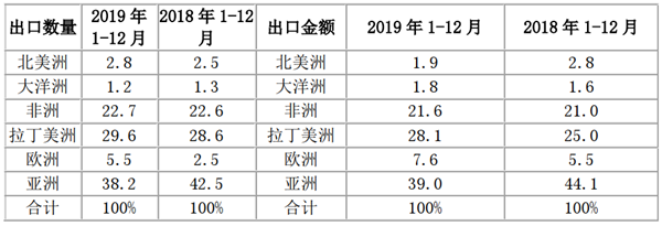 根据海关销售流向区域统计数据整理,2019年1-12月中国客车出口流向全球各大洲的销量占比、金额占比及与2018年同期比较情况表