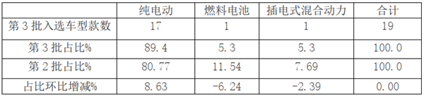 根据第3批推荐目录数据,新能源汽车各细分车型入选款数及占比如下: