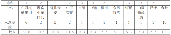 在2020年第3批新能源客车推荐目录中,广西汽车工业集团入选车型最多为6款,占比31.6%,为第一;中车时代、河北长安及中兴智能客车入选各2款,均占据5.3%,并列第二,宇通、中通福田欧辉等7家企业均入选1款,占比均5.3%,并列第三。