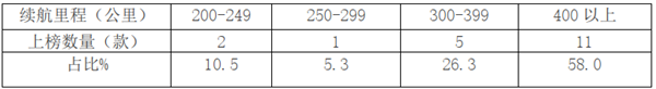 特点七、本批次中续航里程达到400公里以上的占比近6成