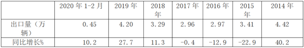 客车出口方面, 2020 年 1-2 月我国客车出口量0.45万辆(此数据是客车统计信息网统计的国内主要大中型客车企业,下同),累计增长 10.2%,近年出口数量及同比如下表: